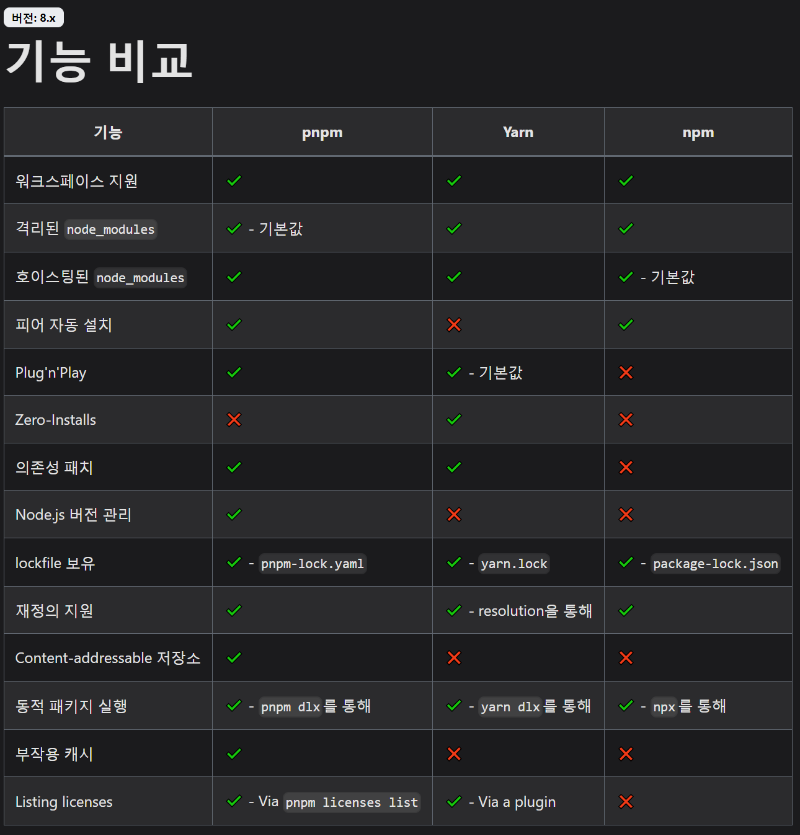 https://pnpm.io/ko/feature-comparison